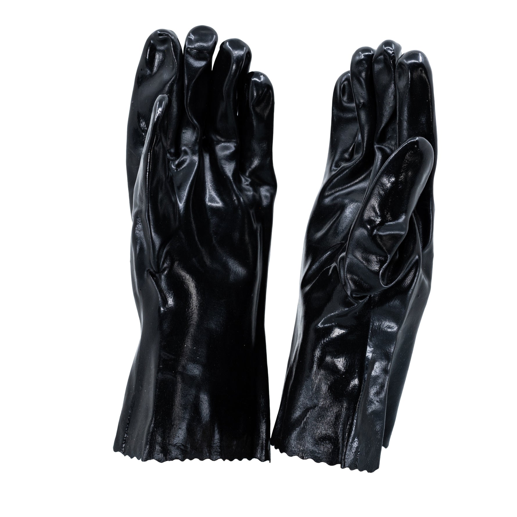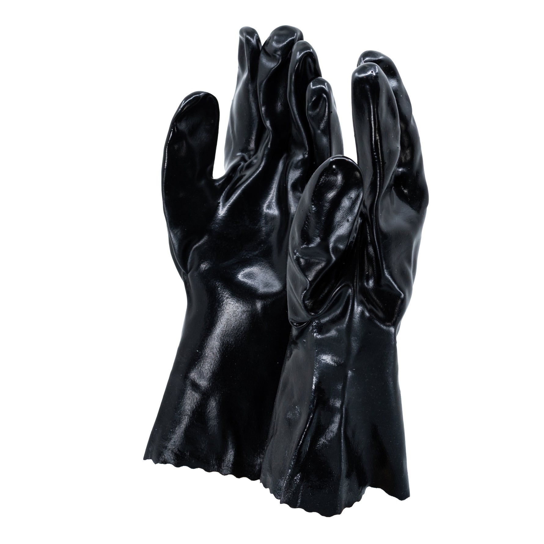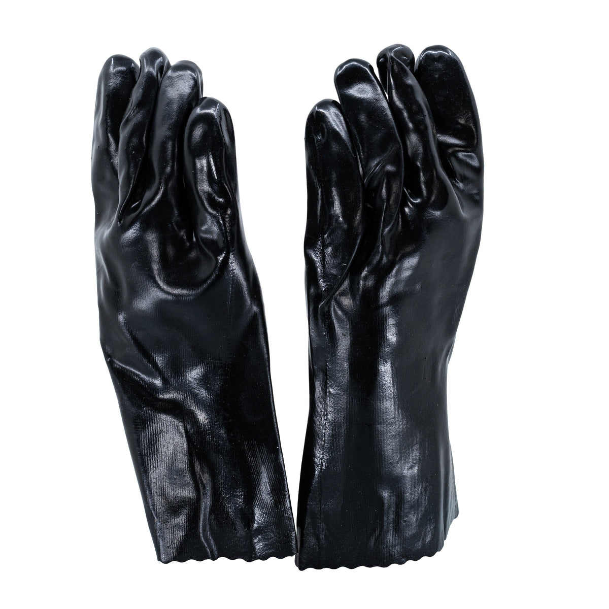 The Black Chemical Gloves are made from a robust mix of 50% PVC and 50% cotton, making them resistant to abrasive environments that may contain hazardous liquids. These gloves feature an interlock lining that provide a secure and comfortable fit and a smooth palm-style winged thumb design for better grip. You can use these gloves to handle greases, oils, acids and caustic substances. The long gauntlet cuff of the gloves is constructed rugged enough to give full protection for the lower arm during prolonged use, making them a good choice in handling produce that has thorns, briars or sharp leaves.